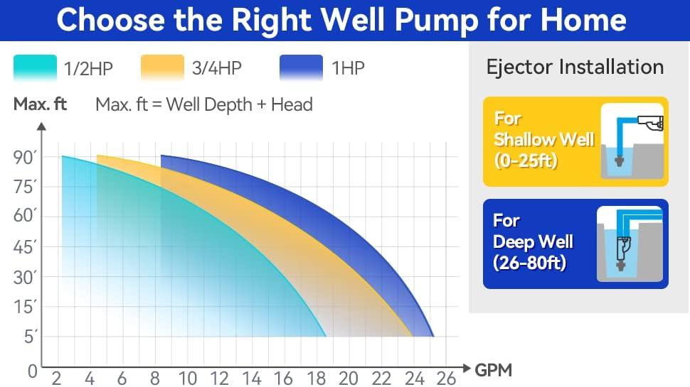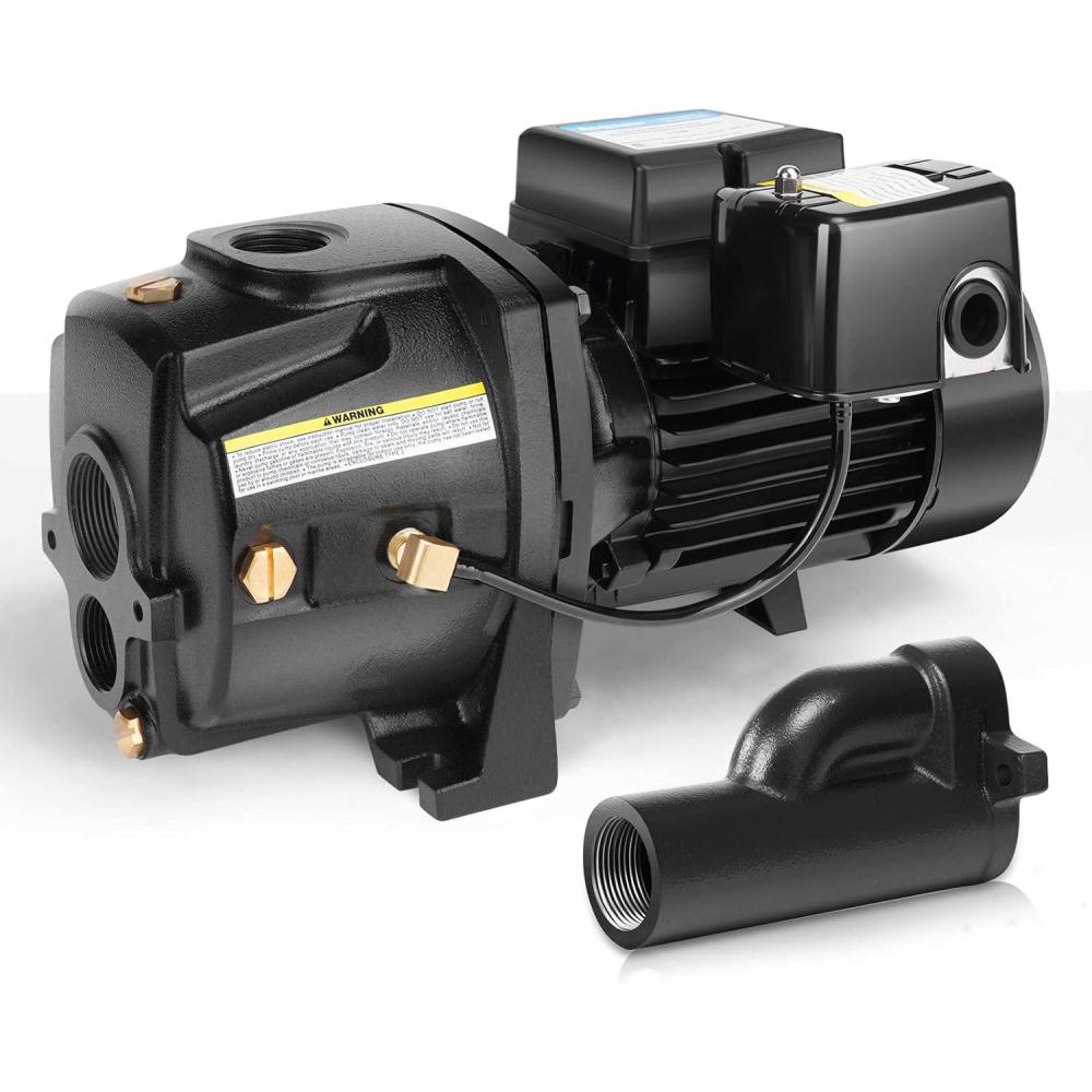Convertible well pump: This pump is designed for single pipe wells (0-25 ft) or two pipe wells (26-90 ft), including venturis and ejector kit. 1 HP electric motor can provide high flow rate with strong suction power. It also can be used as irrigation pumps or lawn sprinkler pumps