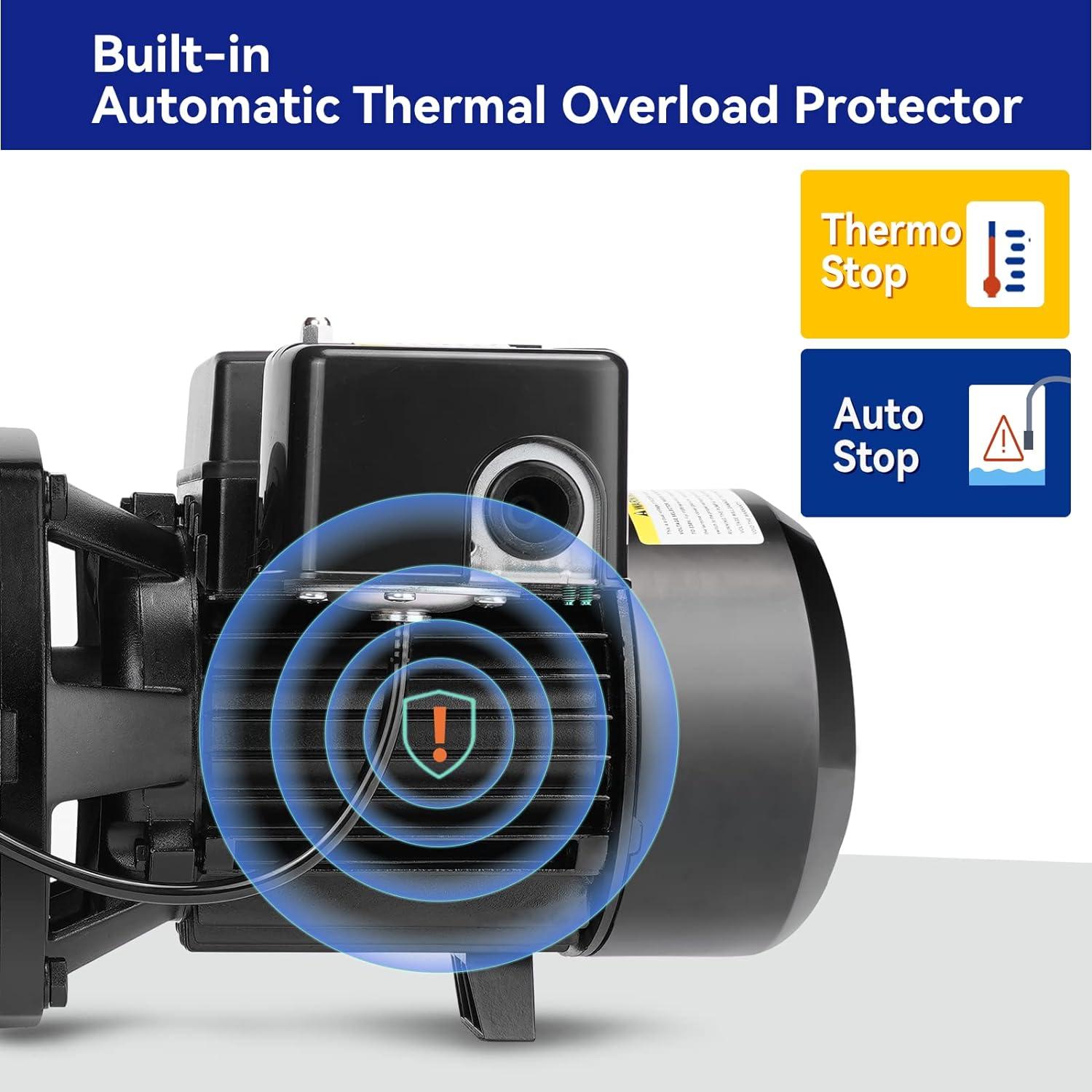 Overheat Protection: Built-in automatic thermal overload protection will prevent the motor from overheating and burning. When the water inside the pump runs out, the intelligent pump will shut off automatically to protect the motor