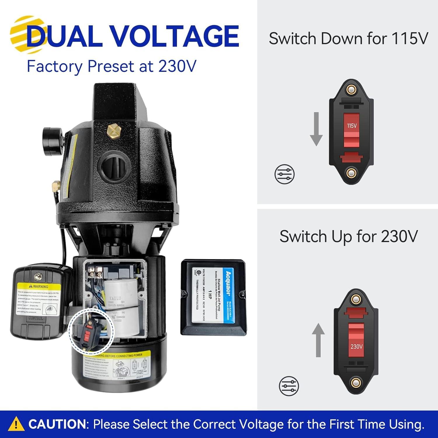 Dual Voltage Motor: This heavy-duty shallow well pump runs on 115V/230V safely. Factory set for 230V.